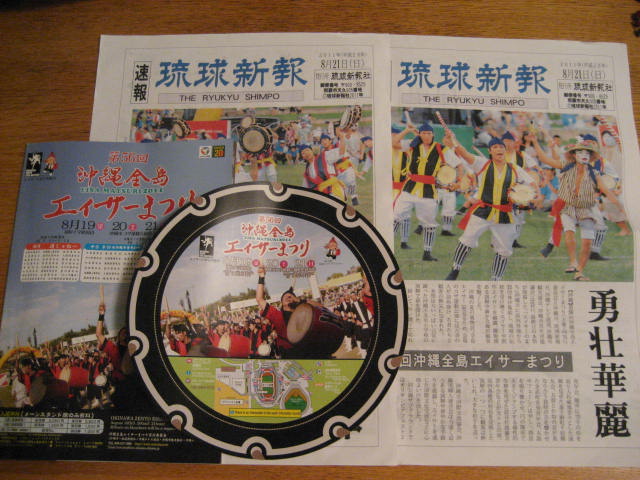 ↓プログラムとうちわと琉球新報が発行した2枚の号外です。
