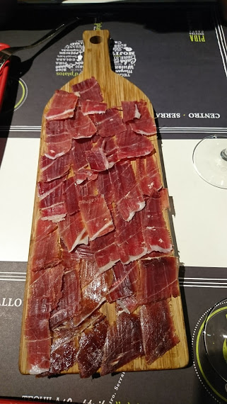 食事は、カルパッチョ、生ハム、パン、サラダ、