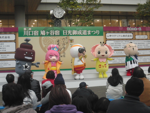 真ん中が、日光のゆるきゃらで「日光仮面」 次が、幸手市の「さっちゃん」