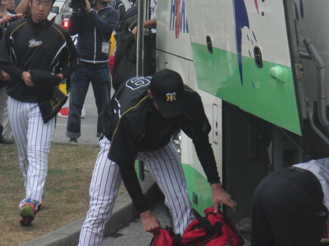 試合が終わって、阪神の選手たちはバスで移動。