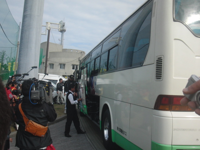 バスからは、藤波投手が一番に降りてきて、先輩達の荷物を出しています。