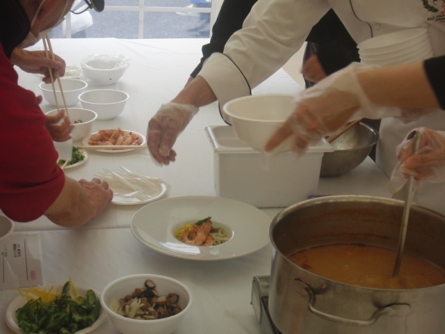白いビニール張りの建物の中では、ホテルのシェフから料理を指導してもらい