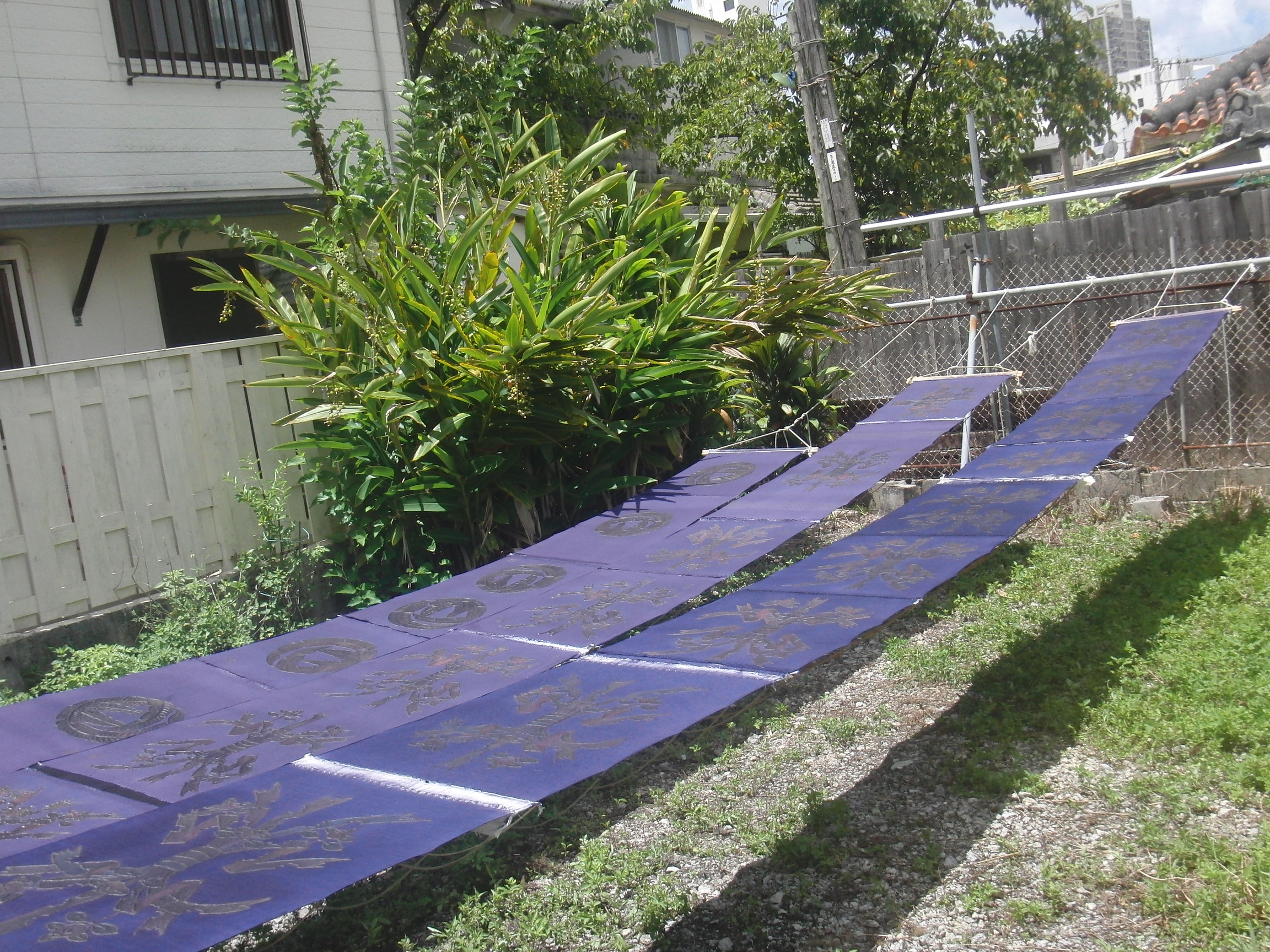 これは、みんなの作品を繋いで、地染めをし、天日干しをしている風景です。