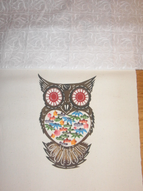ふくろうのテーブルセンターと、刺繍を施した布。