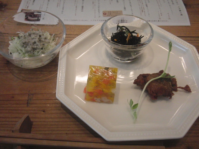 南瓜とトマトのコンソメ寒天(お皿の左)と、鶏レバーの香味揚げ(お皿の右)