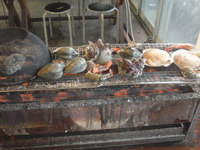 エビ、サザエ、ホタテを焼きました。
